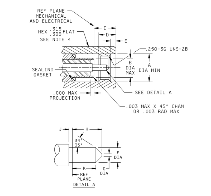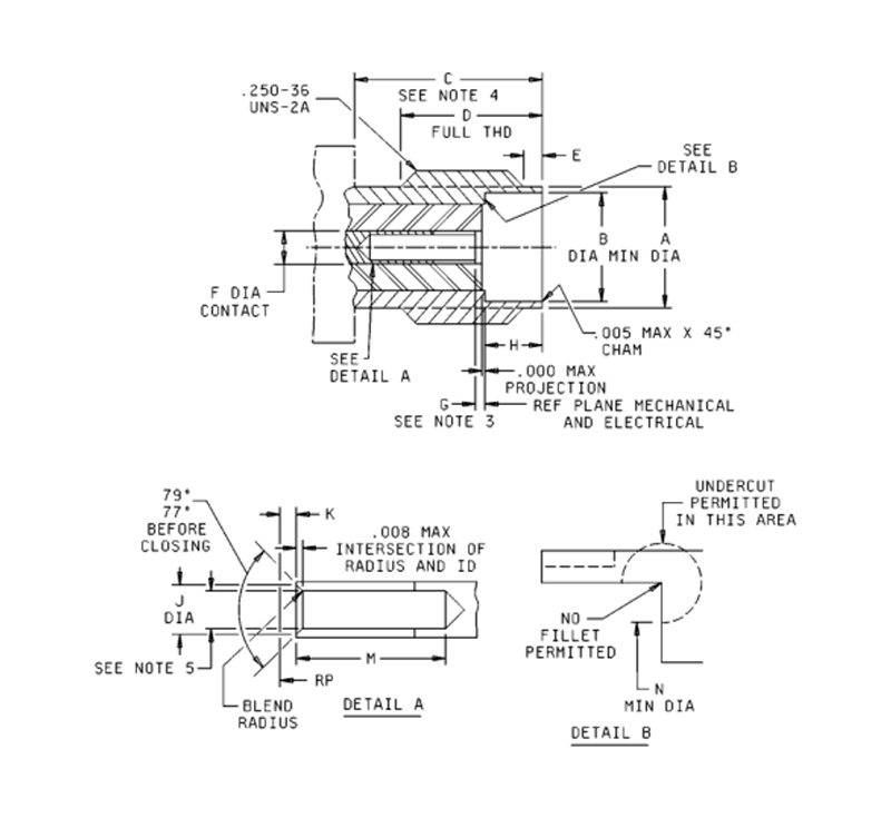 3. Le parti precedentemente qualificate che utilizzano una recessione massima dei contatti di 0,030 pollici (0,76) non sono accettabili per l'uso governativo. È necessario prestare attenzione per determinare se viene utilizzato un design con recessione .030 durante la manutenzione e la sostituzione delle parti.